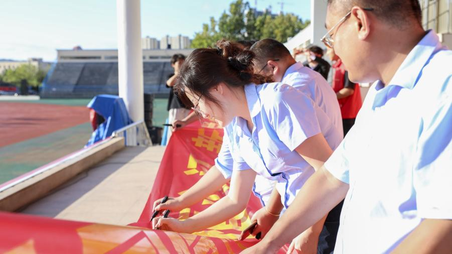 仪式第四项为签字环节。工作人员将签字横幅移至主席台前,学校领导、教师代表与学生代表依次上台,在横幅上郑重签下名字,以实际行动践行爱国承诺。