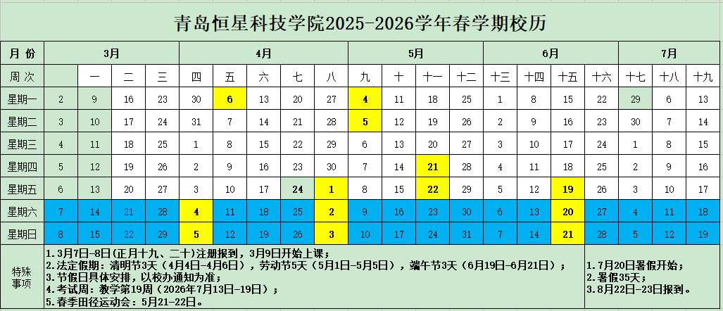 2025-2026学年春学期校历