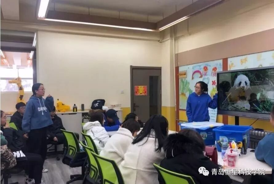 幼儿科技班的同学在讲解大熊猫的特性与建构过程,并与在场同学进行互动。大熊猫在现场的反响十分火热,同学们都积极的参与。