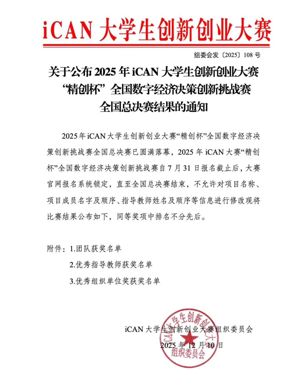iCAN 大学生创新创业大赛是经教育部批准的国家级大学生竞赛项目,入选《全国普通高校大学生竞赛分析报告》竞赛目录,具有广泛的行业影响力与专业权威性。本次 “精创杯” 全国数字经济决策创新挑战赛以响应国家数字经济发展战略为核心,全方位检验参赛团队的战略规划、数据挖掘、商业实战与临场应变能力。
