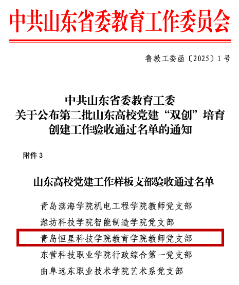 2025年,我校教育学院教师党支部顺利通过山东省委教育工委“山东党建工作样板支部”验收。自2021年11月申报全省党建工作样板支部以来,教育学院教师党支部紧紧围绕立德树人根本任务,对标创建申报目标与内容,持续打造“倾情育火种,共筑幼教梦”的党建品牌。2022年顺利获批山东省党建工作样板支部创建单位,经过3年的建设培育,2025年顺利通过验收。