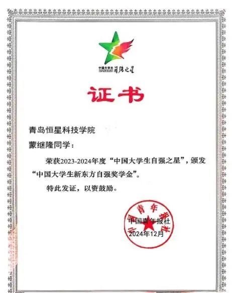 3月,由共青团中央、全国学联指导,团中央基层建设部、中国青年报社主办的2023-2024年度“中国大学生自强之星”奖学金推报活动结果揭晓,经基层选拔、学校推荐、省级初评、全国评审等环节,我院2021级教育技术学本科生蒙继隆荣获“中国大学生自强之星”荣誉称号,并荣获“中国大学生新东方自强奖学金”。