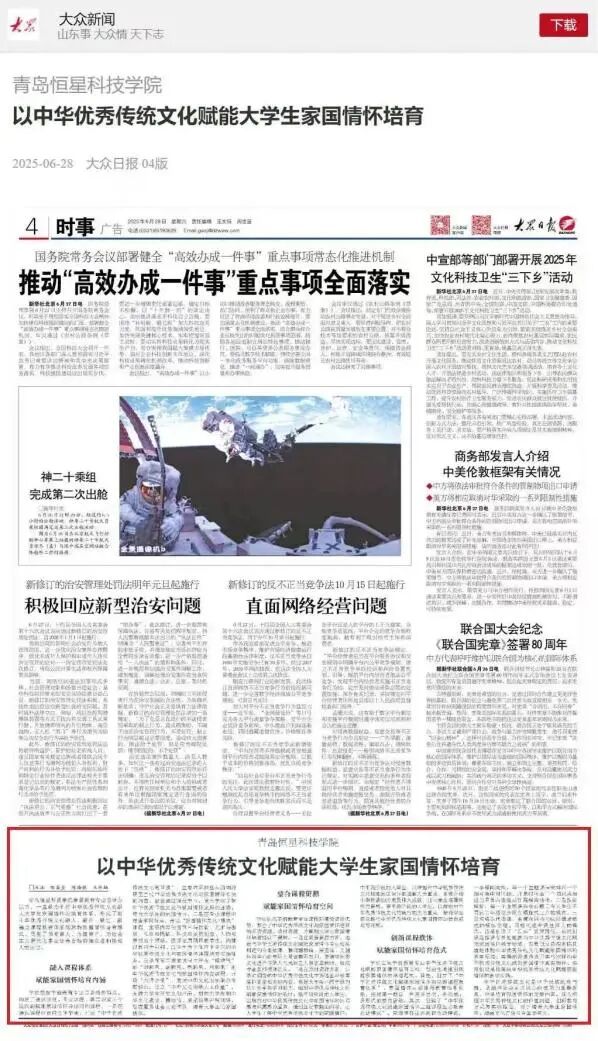 7月,《大众日报》对我院学前教育专业“以中华优秀传统文化赋能大学生家国情怀培育”进行了报道,这一成果引发广泛关注。在新时代教育背景下,我院积极探索育人新路径,将中华优秀传统文化与大学生家国情怀培育深度融合,取得了显著成效。