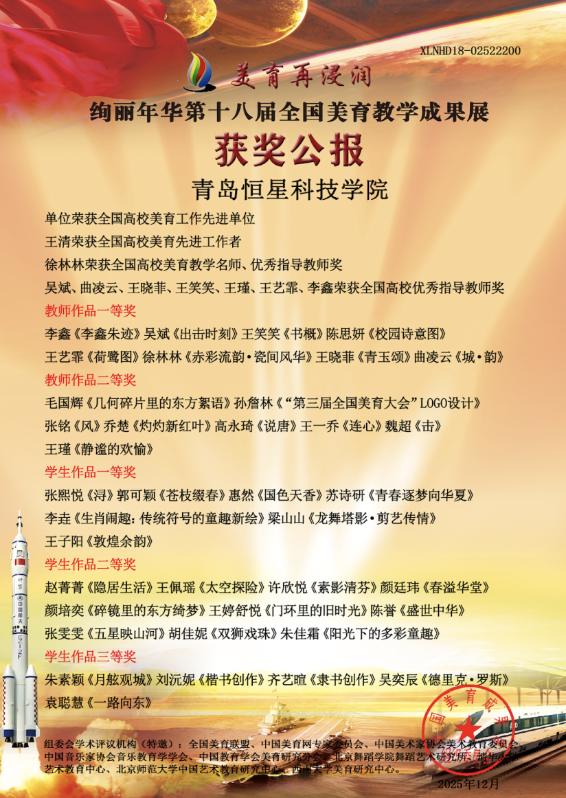 12月,由全国美育联盟、中国美育网专家委员会、中国美术家协会美术教育委员会、中国教育学会美育研究分会、清华大学艺术教育中心、北京师范大学中国艺术教育研究中心、西南大学美育研究中心联合主办的“美育再浸润·绚丽年华”第十八届全国美育教学成果展评选结果正式公布。青岛恒星科技学院未来教育学院在本次国家级权威展评中表现卓越,荣获“全国高校美育工作先进单位”称号,王清荣获全国高校美育先进工作者。教师组获一等奖8项,二等奖8项,学生组获一等奖7项,二等奖10项,三等奖5项,师生获奖作品共计38项!师生作品及个人奖项收获颇丰,全面彰显了学院在美育浸润、师资锻造与人才培养方面的系统成效。