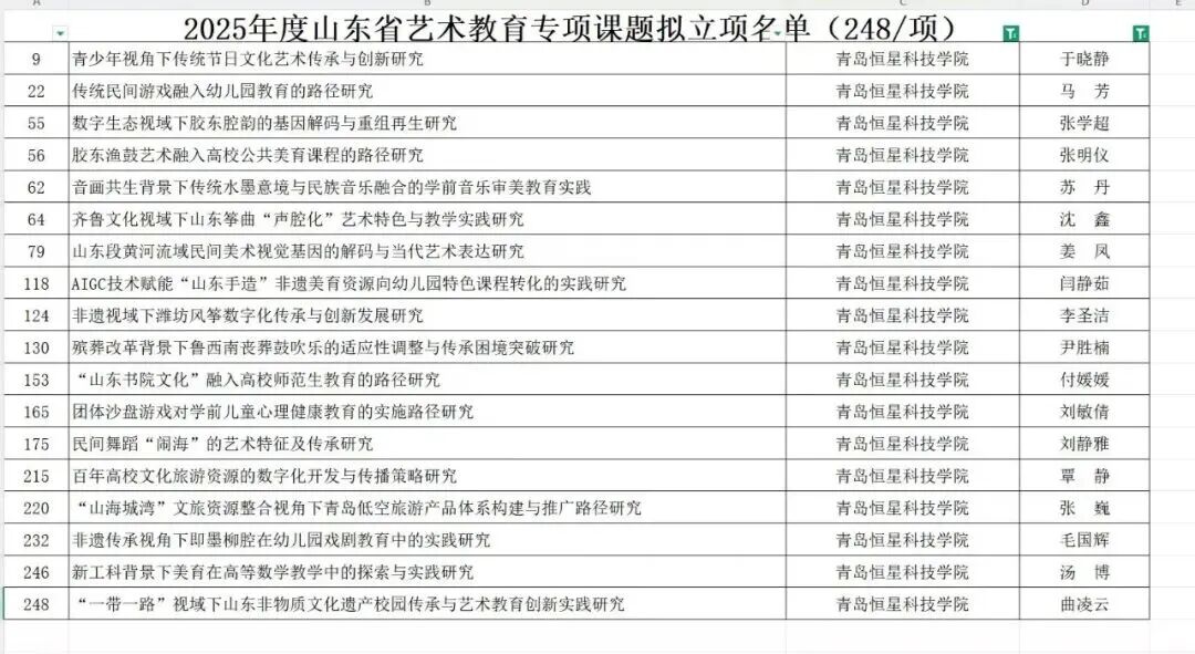 山东省文化艺术科学协会正式公布2025年度山东省“艺术教育”专项课题立项名单,经资格审查、专家评审、公示等严格程序,学院共有18项课题成功获批立项,立项数量在同类院校中表现亮眼,彰显了学院在艺术教育研究领域的深厚积淀与强劲实力。