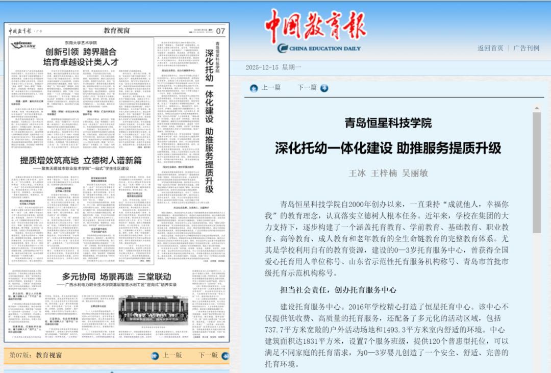 12月15日,《中国教育报》刊发我院文章“深化托幼一体化建设,助推服务增质提效”报道,重点展示学校依托全生命链教育体系资源,在托幼一体化建设的经验做法。近年来,青岛恒星科技学院积极响应国家普惠托育服务政策,以“成就他人,幸福你我”为核心理念,依托学校全生命链教育体系资源,率先在0-3岁托育服务领域深耕实践,通过创新管理模式、深化产教融合、强化社会服务,推动托幼一体化建设迈上新台阶。