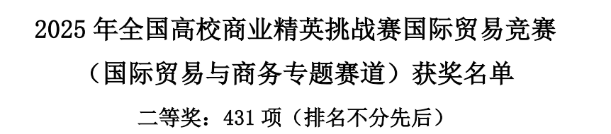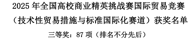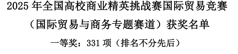 近日,2025年全国高校商业精英挑战赛国际贸易竞赛(RCEP国际市场开拓策划赛道、国际贸易与商务专题赛道、技术性贸易措施评议赛道及涉外商事法律服务赛道)全国总决赛圆满落幕。我校在众多参赛队伍中脱颖而出,荣获国家一等奖2项、国家二等奖7项、国家三等奖3项,同时我校获得最佳院校组织奖。