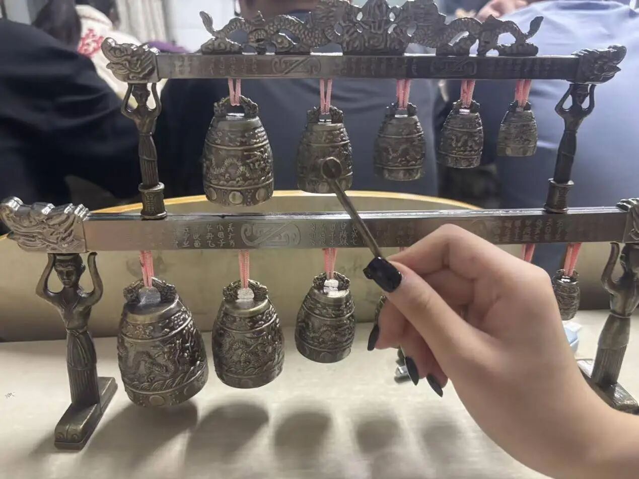 “铛——铛——”清脆悠扬的编钟声在课堂上响起,这是学生们亲手奏响的上古乐章。李老师引导大家近距离观察、演奏迷你小编钟,在指尖与古乐器的触碰中,探寻圣王的道德准则与音乐标准,细数上古圣王的贤德事迹。“原来古人的音乐不只是悦耳,更藏着修身治国的道理。”一位学生在演奏后深有感触。这种理论与实践结合的授课方式,让原本遥远的传统音乐变得可感可及,也让学生在亲身体验中领会“乐与礼合”的古老智慧。