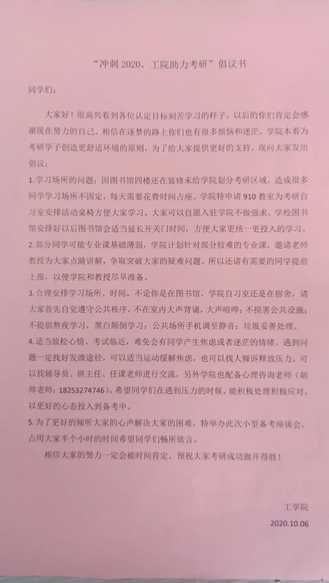 金秋十月,丹桂飘香。又迎来了一年一度令人紧张又期待的研究生入学考试正式报名的月份。时间仿佛更加紧迫。为了给考研学子提供更优质更贴心的支持和帮助,工学院于10.6号召开小型助研座谈会。学院潘娜娜副院长、张菲菲副院长、雷教授、战玉老师以及17级备考学生代表出席了本次座谈会。师生们围绕考研过程中遇到的困难和问题展开了深入的交流讨论。本次专题座谈会让同学们进一步明确考研目标,坚定了考研的信心。