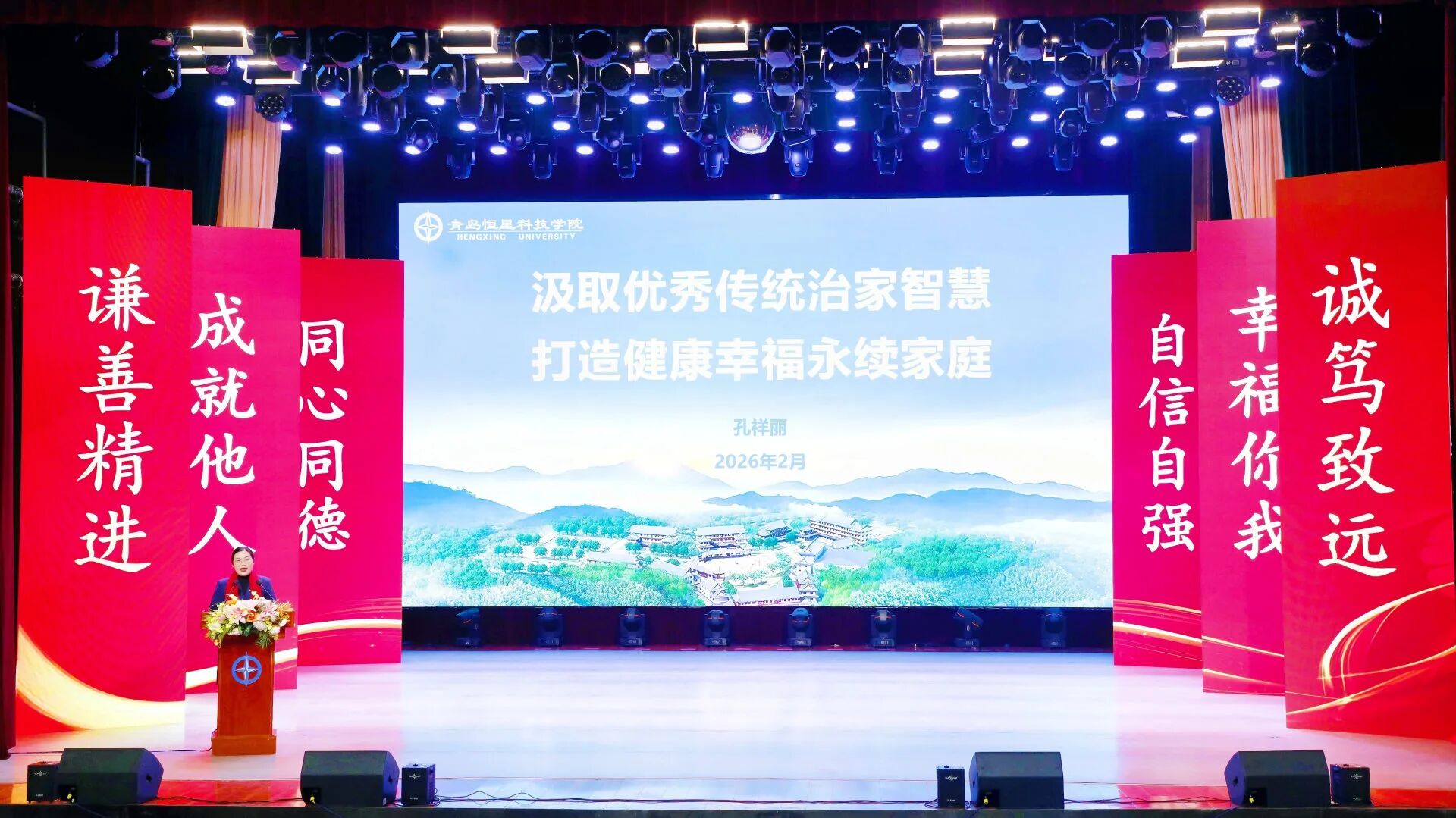 恒星家文化研究院院长孔祥丽教授,以《汲取优秀传统治家智慧,打造健康幸福永续家庭》为主题,深刻阐释传统治家智慧在修身立德、组织管理、文化传承、家庭和睦中的重要价值。分享紧扣价值统一、孝悌和睦、勤俭治业、公平公正、团结共治五大维度,融通经典家训与古今案例,揭示治家、治校、治企的共通逻辑,将中华传统“修身齐家”智慧与恒星办学治校实践深度融合,从人才培养、团队建设、组织管理等层面落地转化,着力打造家人式团队,构建全员共建共享的发展共同体,凝心聚力建设健康、幸福、永续的恒星大家庭。
