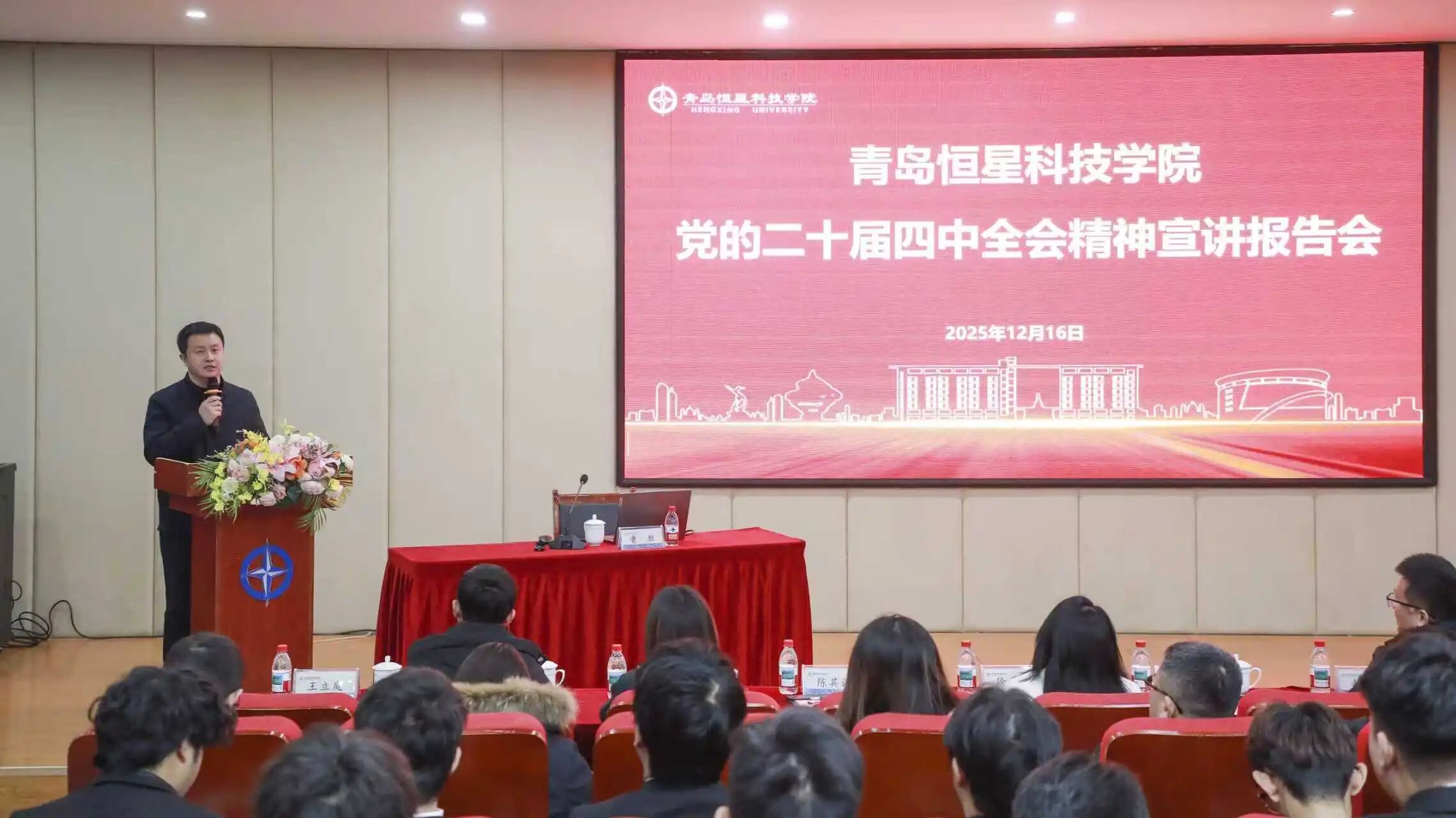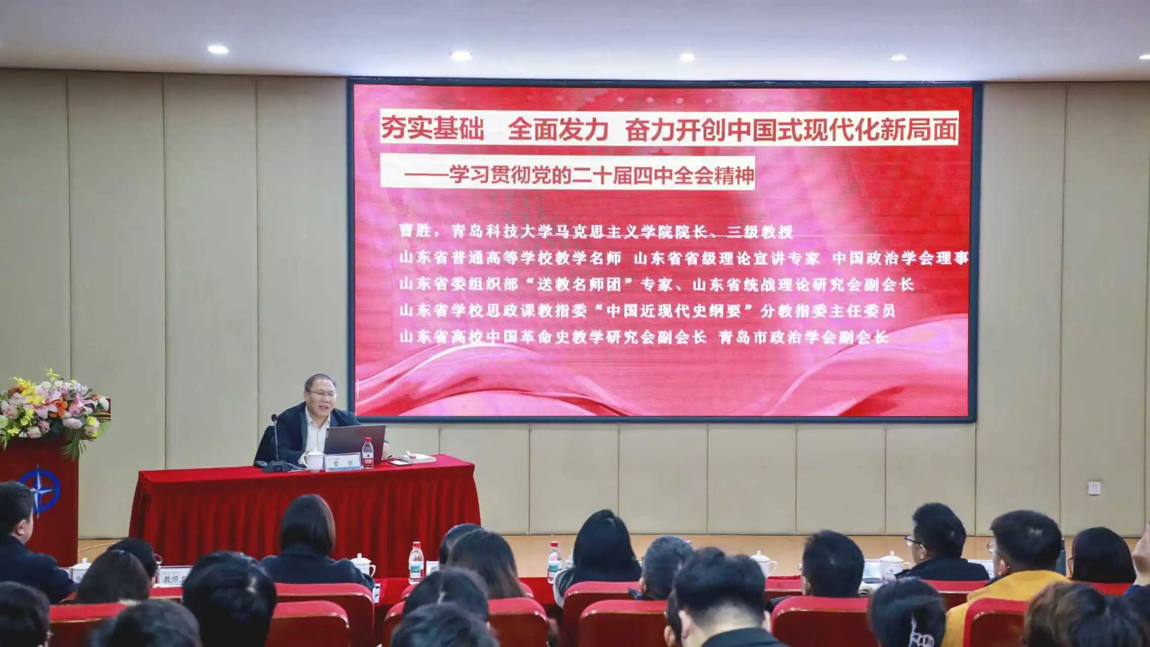 为深入学习贯彻党的二十届四中全会精神,进一步引导广大党员干部和师生员工把思想和行动统一到全会精神上来,12月16日下午,学校在A8-110会议室举行学习贯彻党的二十届四中全会精神宣讲报告会。青岛市教育系统学习宣传贯彻党的二十届四中全会精神宣讲团成员、青岛科技大学党委委员、马克思主义学院党委副书记、院长曹胜教授为我校师生作宣讲报告。校党委副书记、副校长王立庭主持报告会。