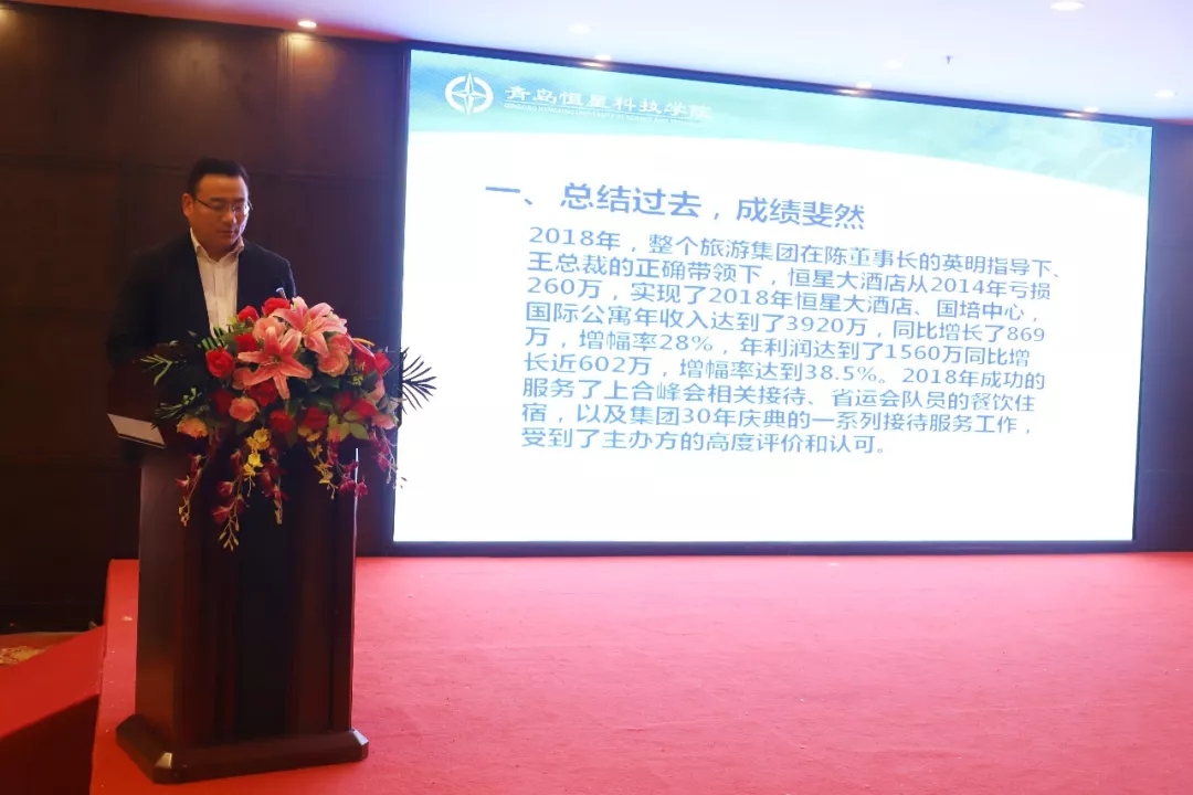 2019年1月26日,青岛恒星科技学院在恒星大酒店恒星厅隆重举行表彰大会。董事长、校长陈昌金,党委书记都光珍、执行校长梁希泉、行政校长王春娟等校领导及集团学校全体教职工参加本次大会,会议由副校长法良山主持。