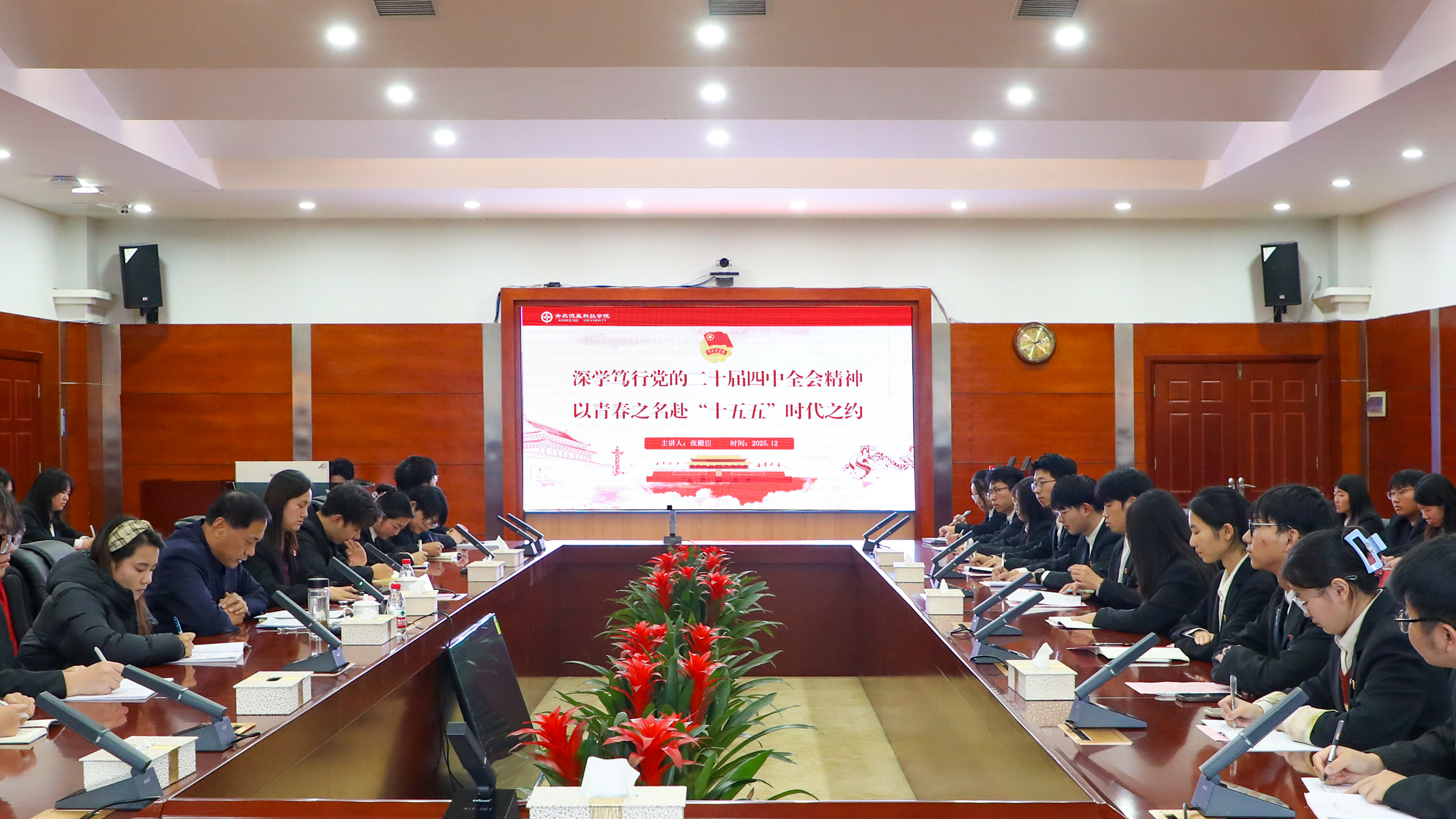 为深入学习贯彻党的二十届四中全会精神,引导青年马克思主义者坚定理想信念、厚植家国情怀,在中国式现代化建设伟大征程中挺膺担当,12月22日下午,我校党委书记张殿臣以《深学笃行党的二十届四中全会精神,在中国式现代化征程中勇担青春使命》为题,为第八期青马学员讲授了一堂立意高远、内涵丰富的专题思政课。本次课程由学生处处长隋立欣主持,全体青马学员齐聚课堂,共学思想、共话成长。