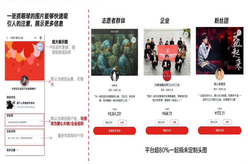 第四步:设置“一起捐”信息,页面大图、头像、发起者名称、发起说明(不超过40个字)等可以设置各种信息。(例如:发起者名称:***公司,发起说明:建一间希望小屋,点亮困境孩子的逆境之光。)