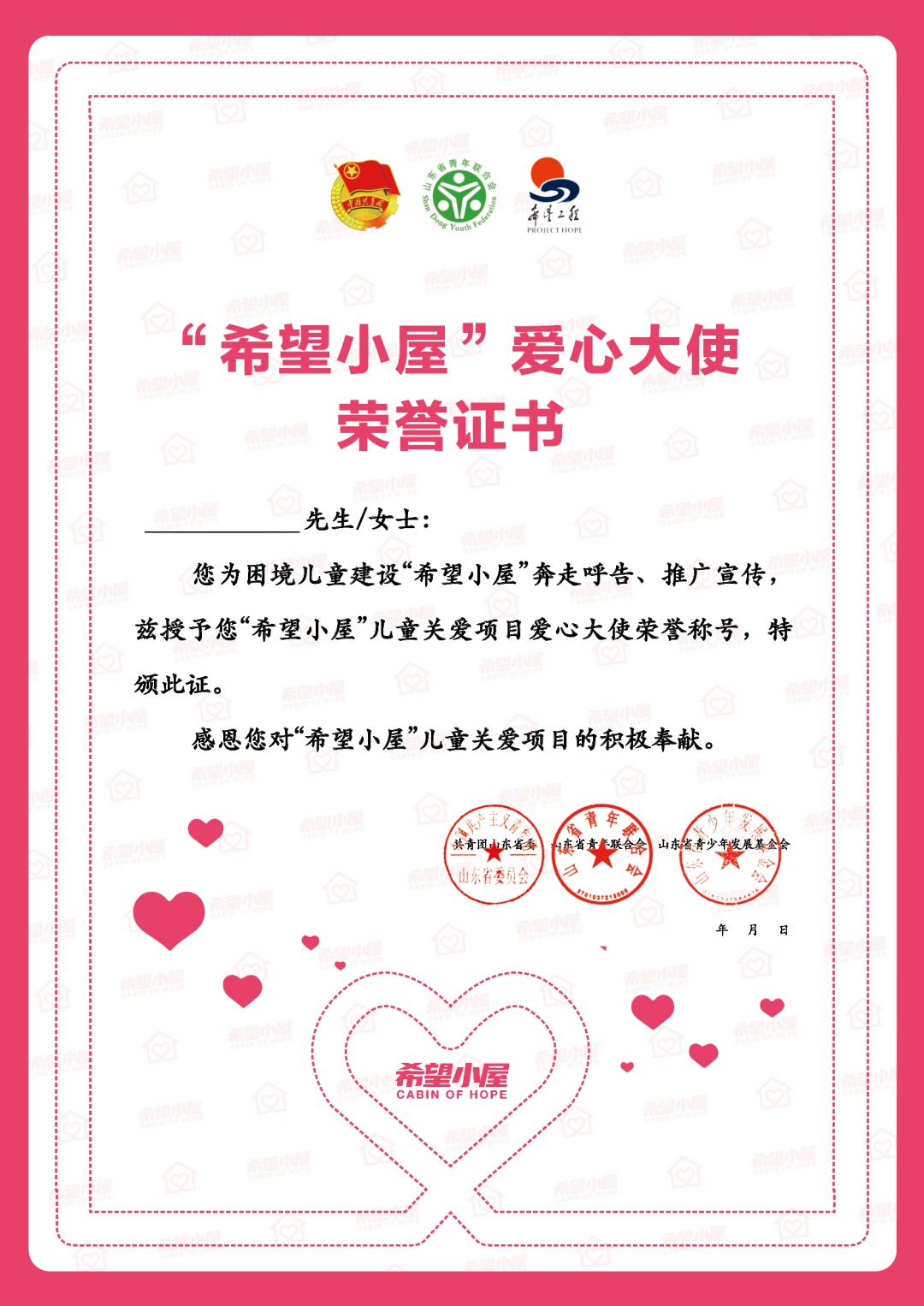 您如果帮助宣传推广希望小屋达到5间以上,我们将为您颁发“爱心大使”荣誉证书。