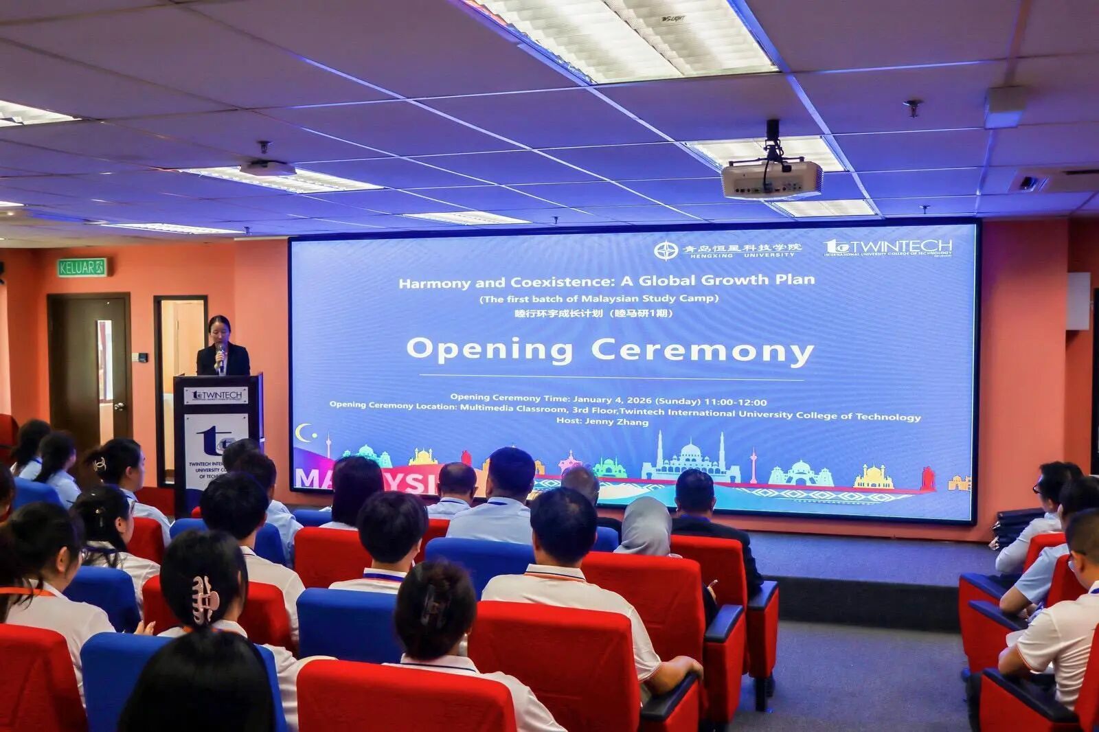 2026年1月4日,“睦行环宇成长计划(睦马研1期)”开营仪式在马来西亚双德科技大学三楼主会议厅隆重举行。该计划由我校主办,马来西亚双德科技大学承办,是一项培养全球英才的研学项目。我校近百名师生,跨越4000公里,从黄海之滨来到南洋学术殿堂,在此开启为期28天的研学之旅。