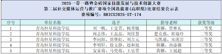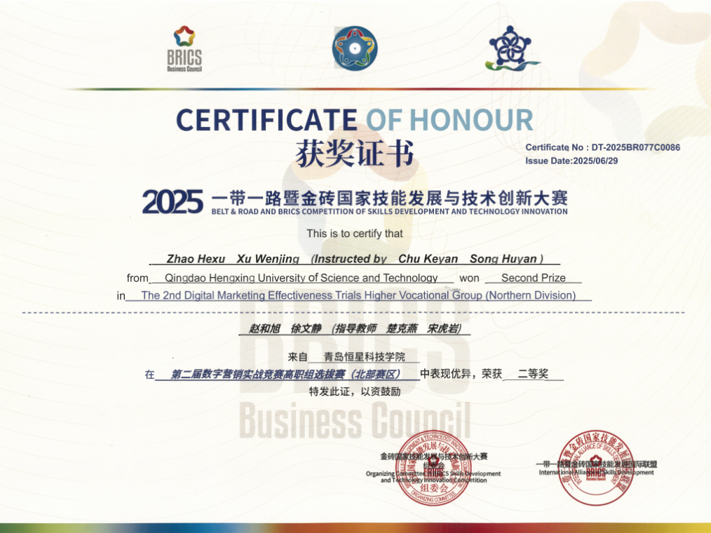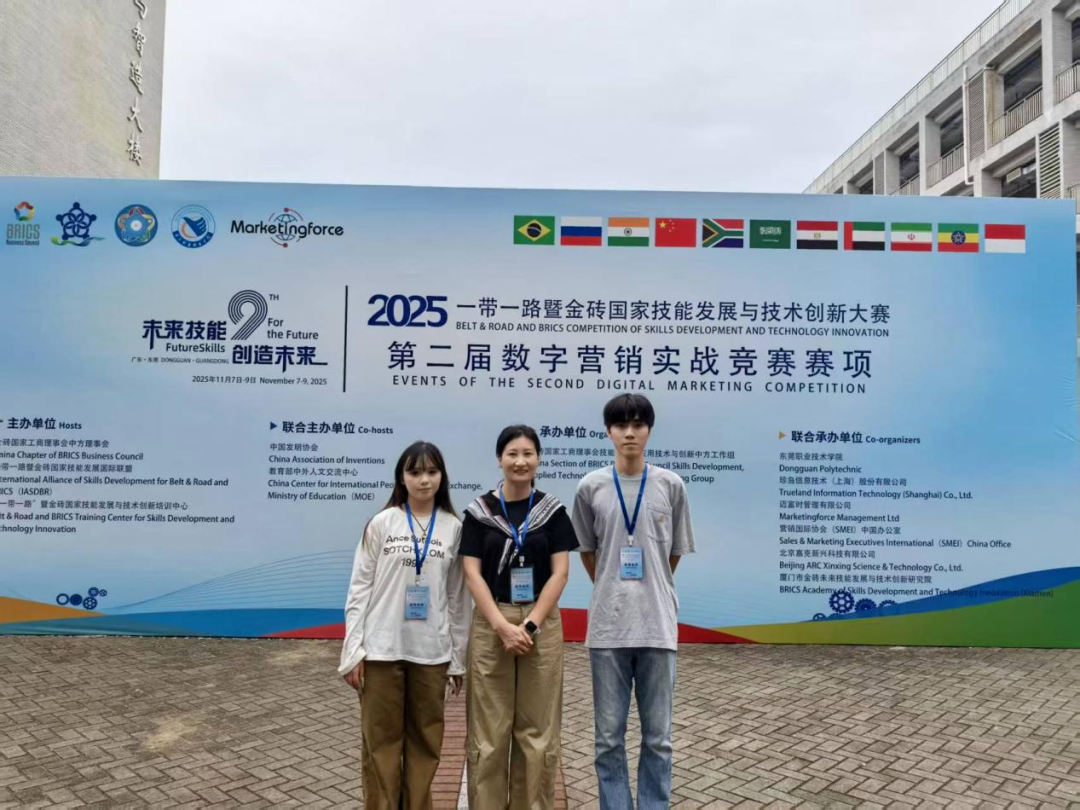 2025年11月,由金砖国家工商理事会技能发展工作组、“一带一路”暨金砖国家技能发展与技术创新大赛组委会联合主办的第二届社交媒体运营与推广赛道、数字营销赛道国赛顺利收官。我校参赛队伍在激烈的竞争中凭借出色表现脱颖而出,荣获2项国家二等奖、3项国家三等奖的优异成绩,充分展现了学校在新媒体运营领域的教学实力以及学生的高素养。