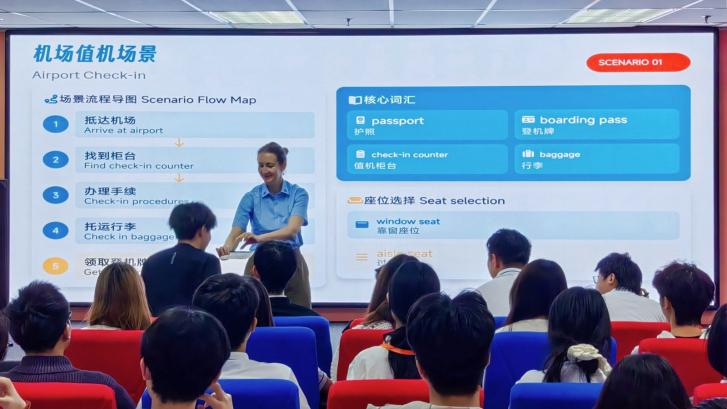 研学首周,语言学习突破传统教室边界。在双德科技大学Maria老师的英语课堂上,学生们通过模拟机场值机、餐厅点餐、酒店入住等真实场景提升口语运用能力。